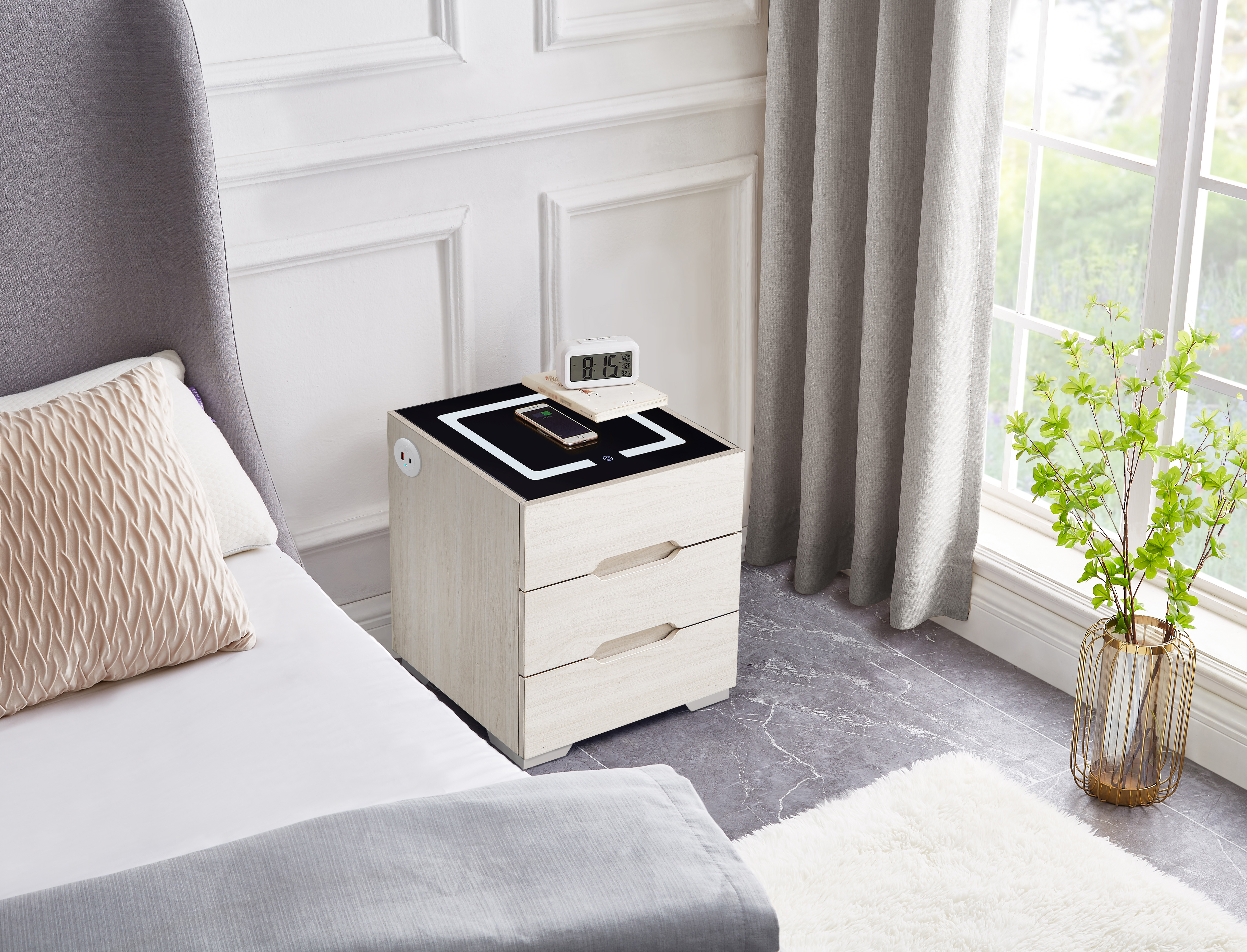 • The smart nightstand is equipped with tempered glass desktop (weight capacity: 35 lbs), which features better wear resistance and also for easy maintenance. Comes with a 3-color LED backlight (warm/cold/natural). Adjustable lighting effects by a simple press touch button.