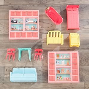360˚ play makes it easy for multiple kids to share space. Hiden storage: Bed, stove, chair and sofa have collectible/accessory storage. For dolls & figures under 7". 3 levels. 8 rooms.