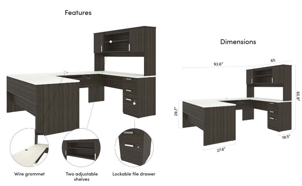 - NOTE: 2 people are required for assembly. 65” W X 65.9” H X 93.6” D for the desk and hutch. The unit is fully reversible. 1 grommet on the bridge for cable management.